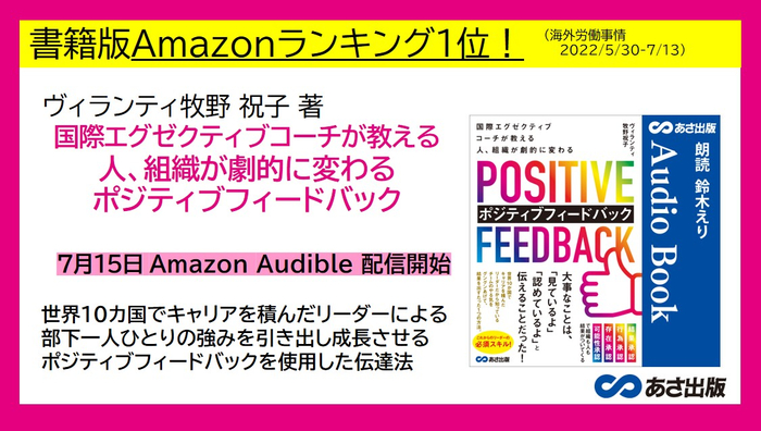 株式会社あさ出版(代表取締役:田賀井弘毅、所在地:東京都豊島区)は、世界最大級のオーディオブック及び音声コンテンツ制作・配信サービスであるAmazon Audibleにて、ヴィランティ 牧野 祝子 著『国際エグゼクティブコーチが教える 人、組織が劇的に変わる ポジティブフィードバック』( https://amzn.t )の配信を2022年7月15日に開始いたします。