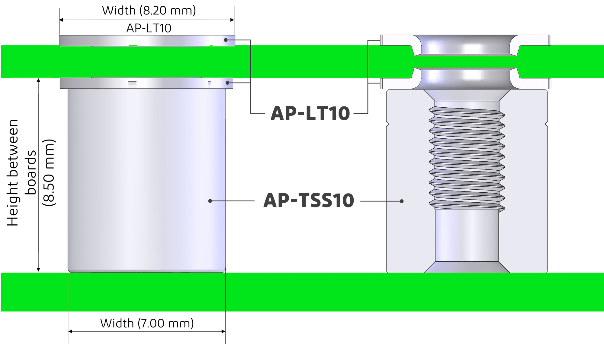 AP-TSS10は基板上にSMT※で実装、AP-LT10はもう一方の基板のスルーホールの上下にリフロー※で実装します。両方の実装後、最後に上からネジで締め付けることにより基板間接続を行います。AP-TSS10とAP-LT10を使用することで、ネジ結合の際に基板へかかるダメージを軽減させる効果があります。