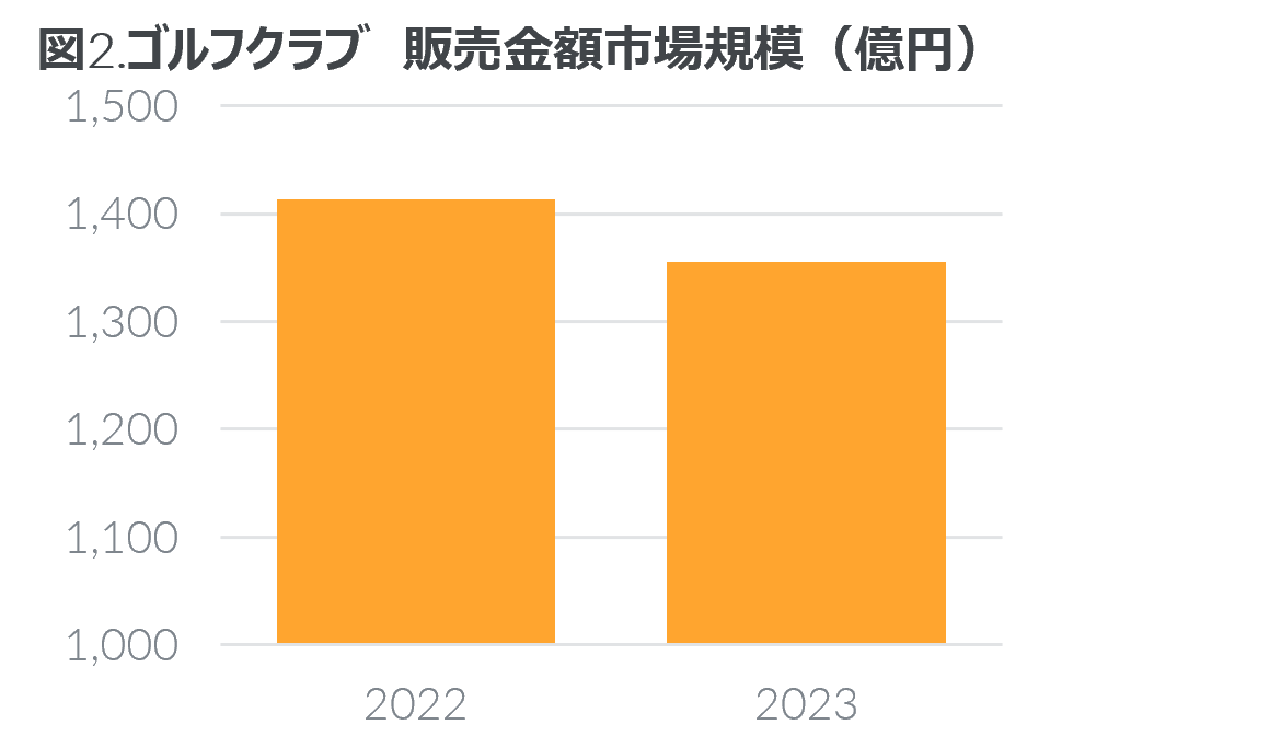 ゴルフクラブの販売は、コロナの影響が出た2020年から2022年年の間は、商品の不足による販売機会ロスなどがあり、需要に追い付かない側面があった。しかし2023年には供給不足も一定の落ち着きを見せ販売機会ロスも目立たなくなる中、販売が不振となったことで在庫消化が進まず苦戦した。新製品の発売が市場を押し上げる場面もあったものの、年間トータルでは2022年を下回り、前年比4.1%減となった(図1)。
