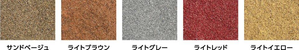 サンドベージュ、ライトブラウン、ライトグレーはカラーサンドと色味を合わせており、透水性が必要な箇所はカラーサンド、基礎コンクリート上のオーバーレイ箇所を同色のカラーサンド・レジンで施工するといったことも可能です。