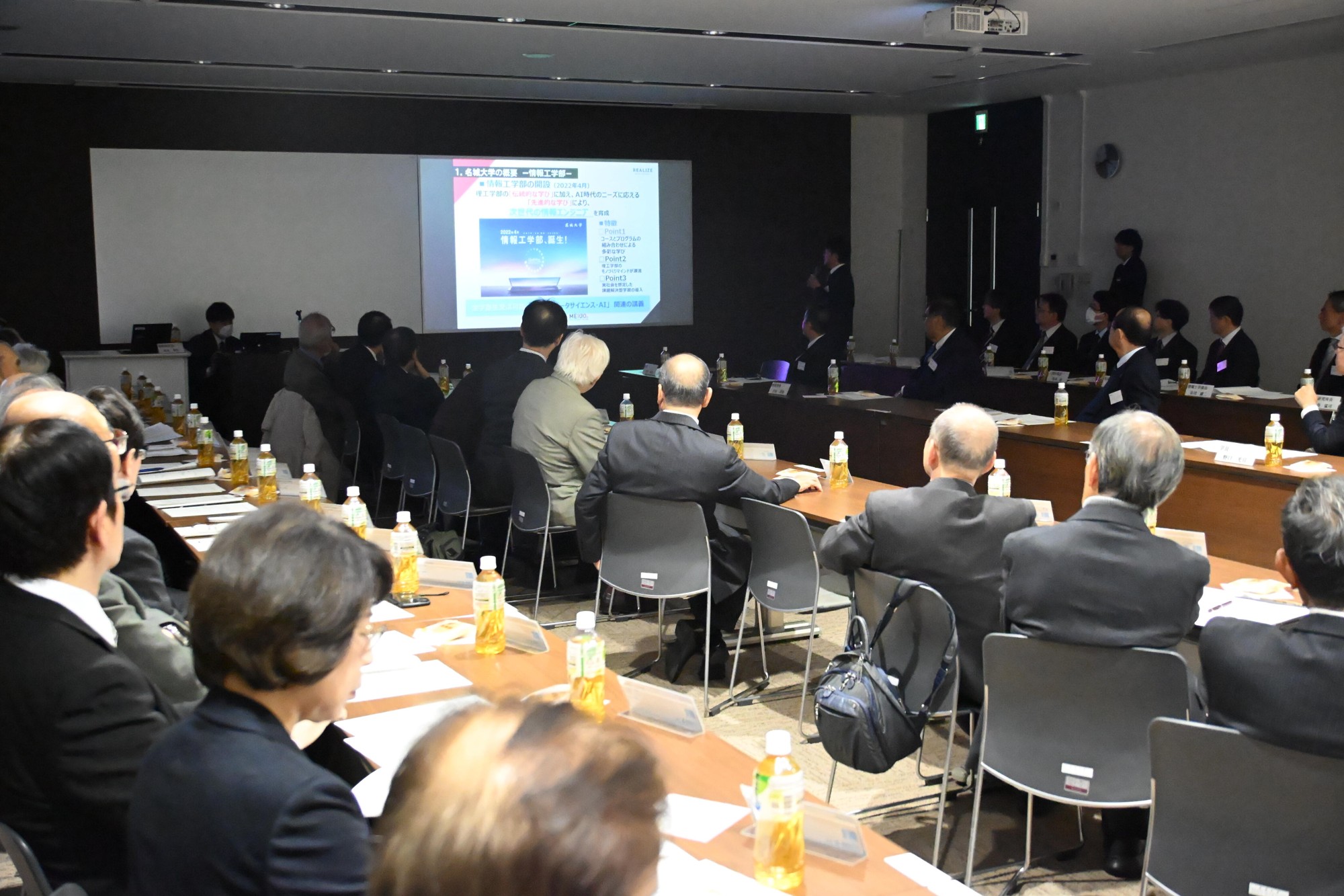 続いて、矢野幾也業務執行理事から現在の本学の概要が説明され、実就職率が15年連続で全国私大1位であることなどの実績や建設中のアリーナなどの施設、さらに「創造型実学」を軸に据えた将来ビジョンなど、開学100周年を迎える名城大学についての紹介がありました。