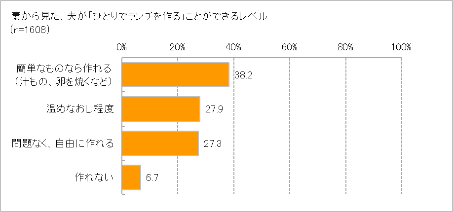 在宅勤務やステイホームが推奨されたこともあり、夫が家で昼食をとる回数が増えた家庭も少なくありません。ところが、夫がランチを「自由に作れる」のは27.3%どまり。「簡単なものなら作れる」38.2%、「温めなおし程度」27.9%と、作れないこともなさそうですが、自由回答には、ランチのワンオペに悩む妻の声が多数寄せられています。「夫婦ともテレワークなのにランチは私が作るので、昼休みになりません」(50代・フルタイム)、「料理の負担が増えた。せめてランチは自分で作って!」(30代・専業主婦)のように、夫の「ひとりでランチ作れない問題」は、Withコロナ時代の新たな課題と言えそうです。夫が苦手な台所仕事を探っていくと、「複数の料理を段取りよく作る」67.8%、「材料を切ることや下処理」46.0%、「煮たり焼いたり揚げたりすること」44.6%などがあり、技術的にすべての工程をひとりで進めるのが難しい現実も見えてきました。