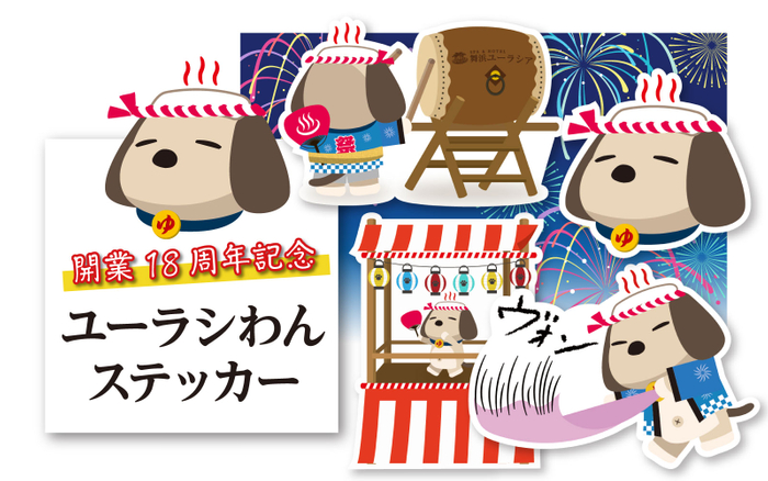 開業18周年のテーマである「祭」をイメージしたユーラシわんのステッカーは祝祭感あふれるデザインです。