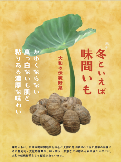 田原本町味間地区で代々受け継がれている「味間いも」の試食販売会を開催します。キメが細かく、強い粘りが自慢で、一度食べるとまた欲しくなる、ねっとり系のさといもです。この機会にぜひご賞味ください。