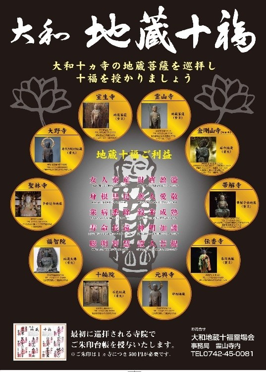 奈良県内の魅力ある地蔵菩薩を安置する十カ寺の地蔵尊を巡拝することで福徳が授かる「大和地蔵十福」。地蔵十福とは、地蔵本願経や延命地蔵経で説かれており、十カ寺の地蔵尊を巡拝・満願すれば、「女人泰産(健康で聡明な子どもの安産が叶います)」、「身根具足(健全な心と身体を授けてくださいます)」など、十の福が授かります。
