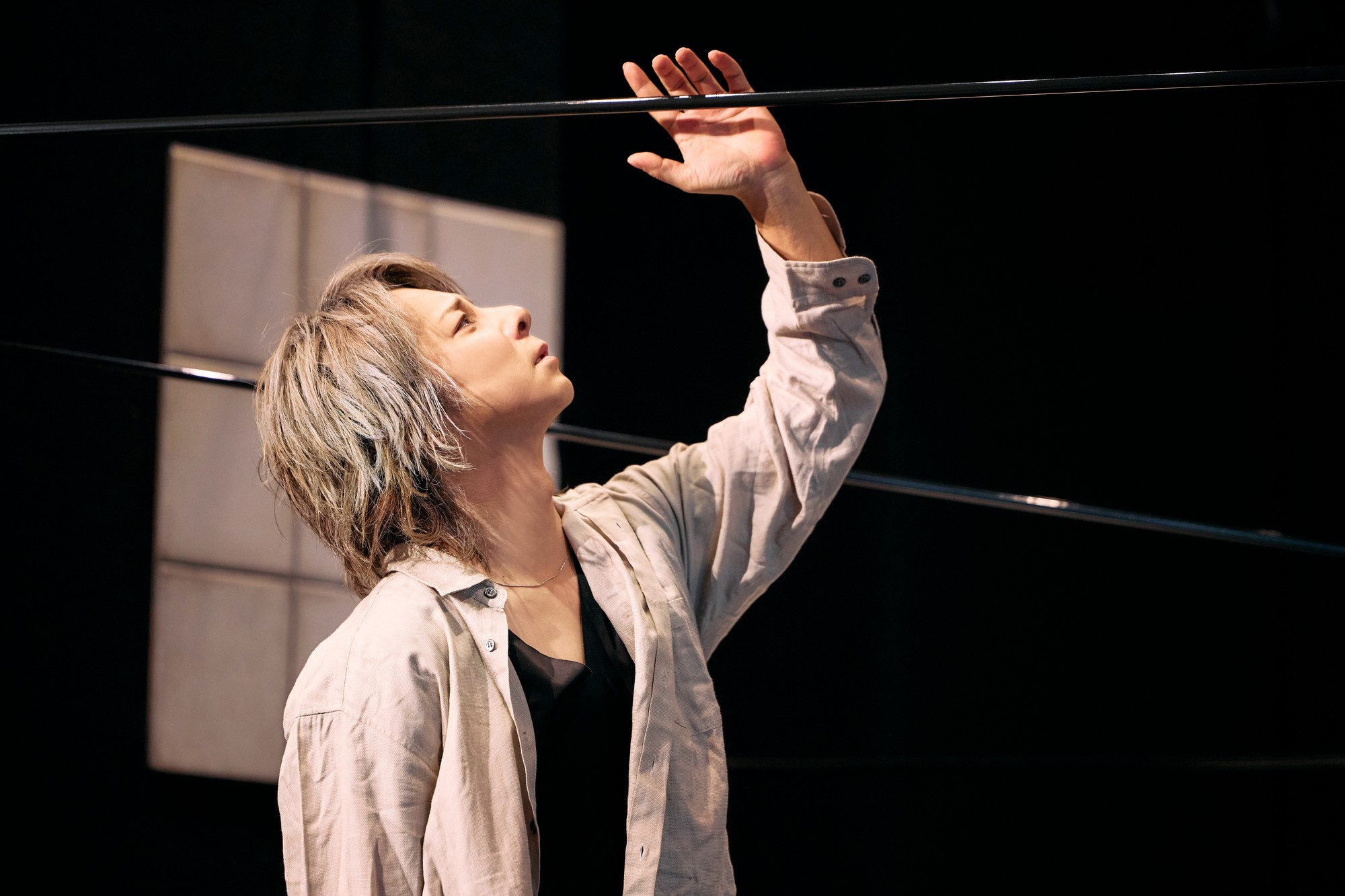 白井氏は「ボウイが、自分ががんと分かってから作り始めた作品。ニュートンの話しではあるけれど、ボウイが経験した話しかもしれない。メタシアトリカルな表現もあって、つまりそれは普遍性を持っているっていうこと。舞台を観た人それぞれが、自分の話と思ってもらえるようになればいい」と思いを吐露。「言葉の物語だけど、言葉以外に想像するものがあると今日、観ていて感じた」と回想。ニュートンが天に手を伸ばす最後の場面まで、90分以上をかけて、舞台をよりよくするための案が出されていた。