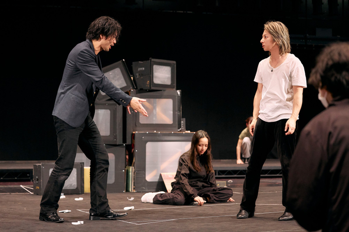 歌唱シーンの確認を終えると10分ほどの小休止に入った。それぞれが一息入れた後、「さて、いくぞ」という様子で立ち上がった演出の白井晃氏は、台本を手に出演者らの前に立つと「今日からやることは、1つ1つのシーンで何を見せなくちゃいけないのかということに重きを置くこと。空間全体に緊張感が走るように。自分のキャラクターを前面に押し出して、セリフが持つ1つ1つの意味を考えながら動いて」と声をかけた。