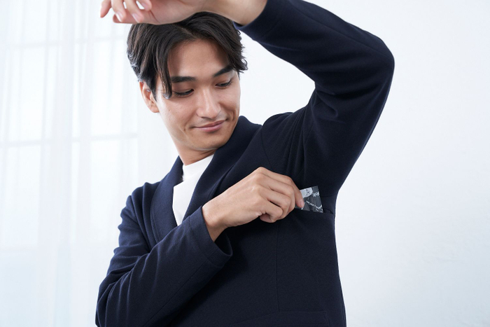 このようにして完成した今回のテレワーカー向けジャケットは、見た目の「きちんと感」と動きやすく快適な着心地の「過ごしやすさ」を両立しました。生地は「リモート会議できちんと見せたい」という意見から編み目の詰まった上品な表面感と適度な厚みが特徴のサーフニット生地を採用。ハリがあるので襟崩れがしづらく、光を反射しにくいのでモニター越しでもテカリが生じず、落ち着いた印象になります。ジャケットの腕回りやウエスト周りはゆとりをもたせ、着丈を短めにする他、袖部分のボタンをなくすなどコミュニティメンバーの声を反映し、リラックスして仕事ができるようなデザインにしました。また、裏地は涼感素材を使用しており、着用時の快適性を保ちます。