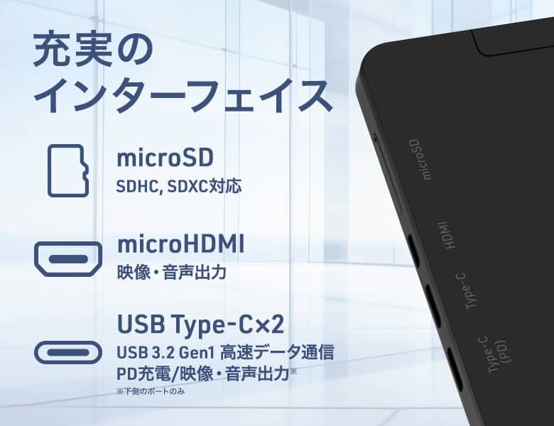 2つのUSB Type-CポートはどちらもUSB3.2 Gen1を採用しており、迅速なデータ転送を実現。特に片側のポートはPD充電にも対応しており、急な外出時にも付属の電源アダプターを使って素早く充電が可能です。さらにこのポートは映像・音声出力にも対応しているため、microHDMIと合わせて活用し、マルチモニター環境での作業効率を大幅に向上させます。
