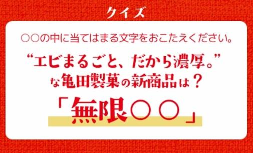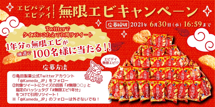 今回、皆様からのご愛顧に感謝して『無限エビ』が1年分当たる「エビバディ!エビデイ!無限エビ」キャンペーンを実施。亀田製菓公式Twitter(@Kameda_JP)をフォローし、クイズに答えて対象