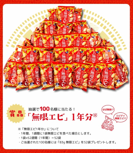 ・ご当選された100名様には『83g無限エビ」を52袋プレゼントします。