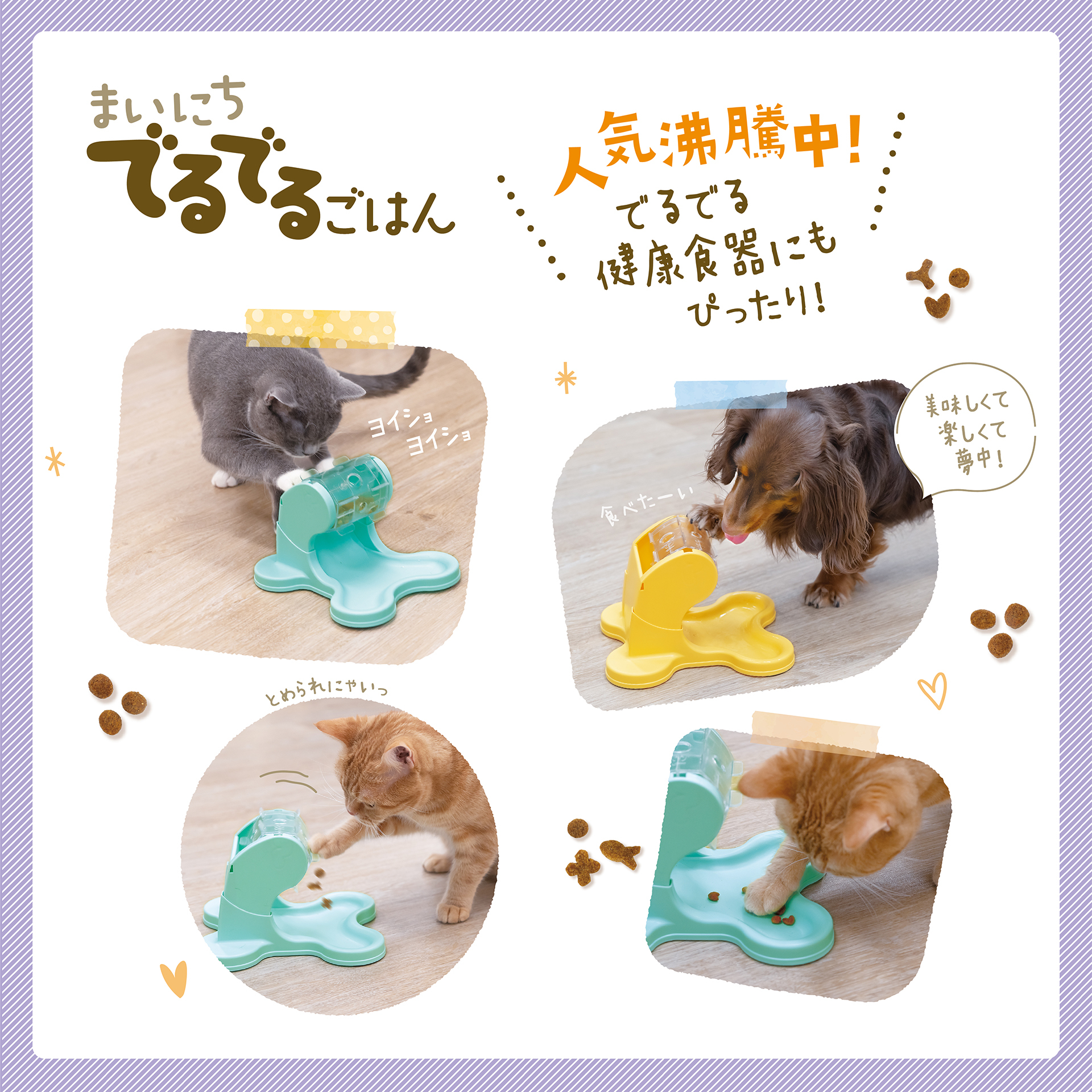 『まいにちでるでるごはん』は、ドギーマンの人気商品『でるでる自飯器(回すことでフードが出てくるガラポン式おもちゃ)』などのおもちゃに入れで簡単に楽しみながら食べられる栄養バランスに優れた『総合栄養食』です。