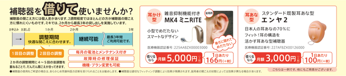 月額3,000円~(+税) 定額にて補聴器を貸出いたします。使えるようになるか不安な方は、まずは補聴器を借りることから始めてみませんか?