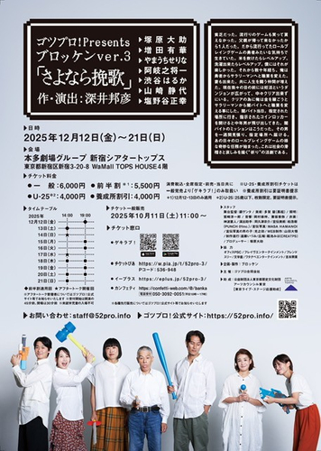 ゴツプロ!Presents / ブロッケンver.3『さよなら挽歌』が2025年12月12日 (金) 〜 2025年12月21日 (日)に新宿シアタートップス(東京都 新宿区 新宿 3丁目20-8 WaMall TOPS HOUSE ビル4階)にて上演されます。