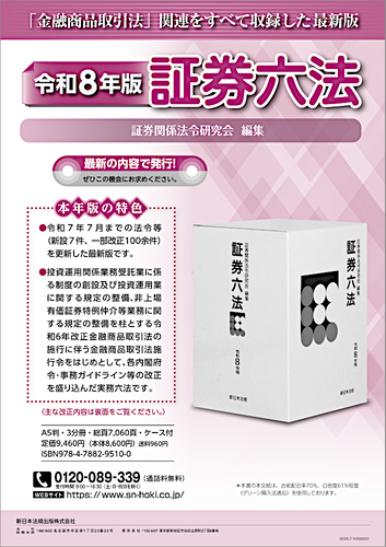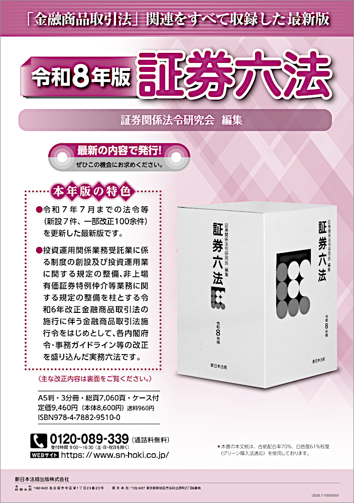 新日本法規出版株式会社(所在地:愛知県名古屋市中区、代表取締役社長:河合誠一郎)は、新刊『証券六法 令和8年版』 (編集:証券関係法令研究会)を2025年9月12日(金)に発売いたしました!