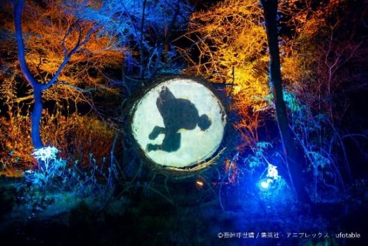 1.2㎞の夜の森を歩きながら、プロジェクションマッピング等で再現された「鬼滅の刃」の世界を体感。
