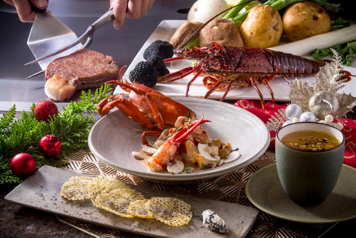 フォアグラやオマールなど山海の幸を贅沢に。コース「聖夜」では松阪牛ロース100gが登場