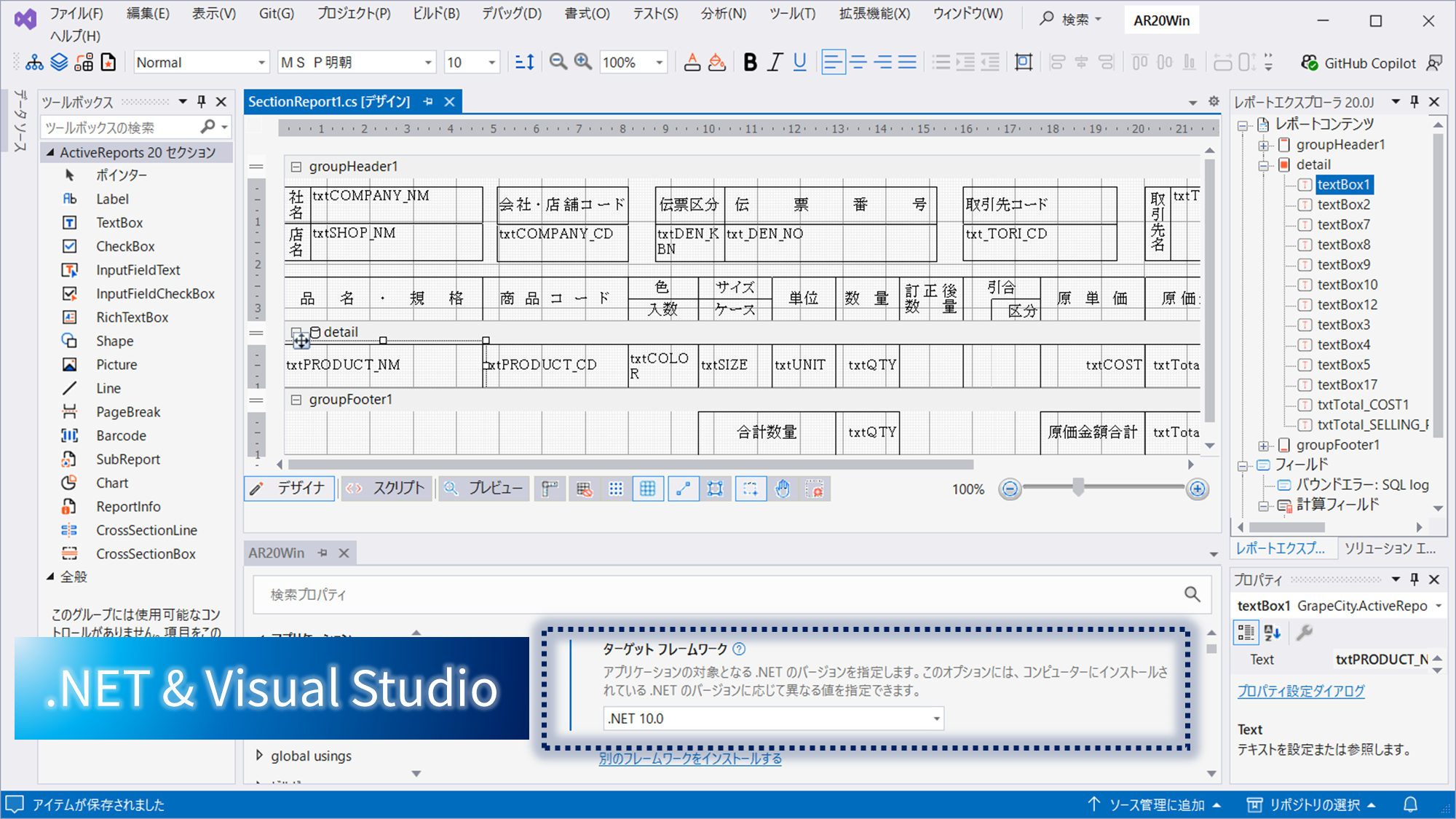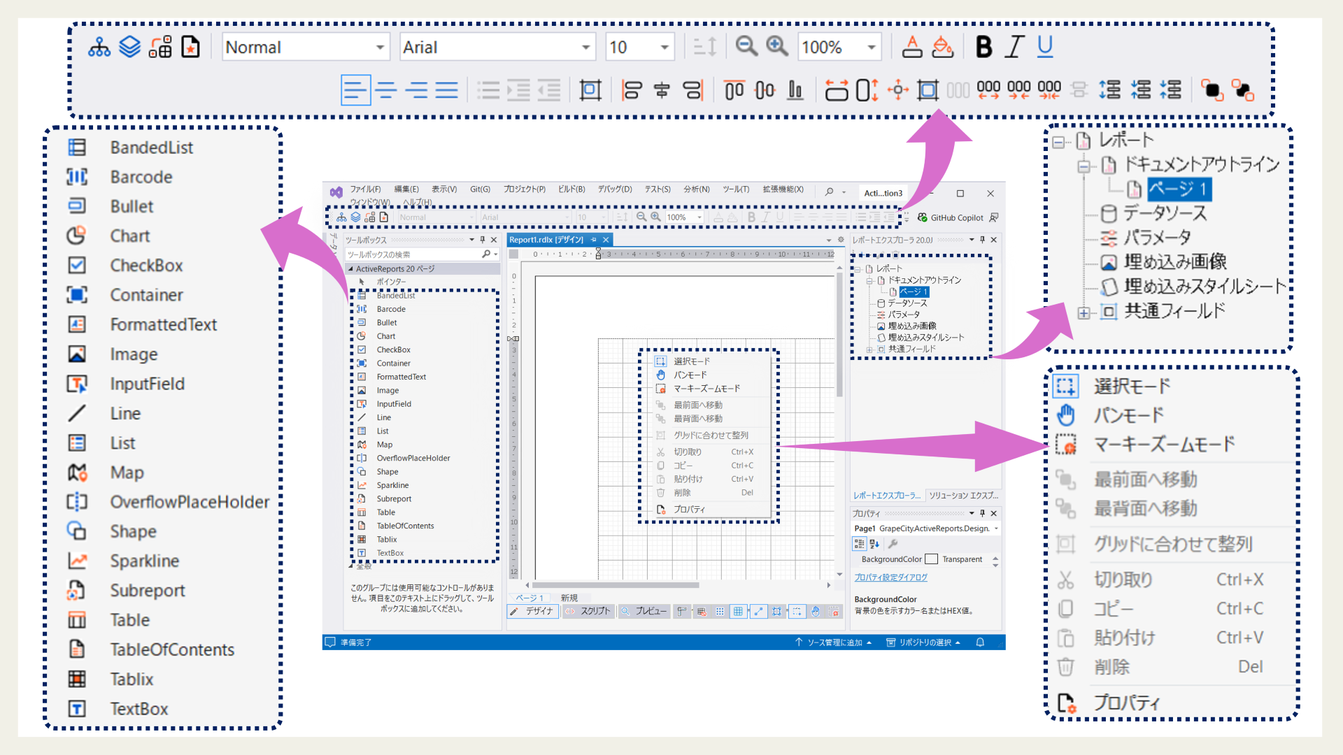 Visual Studioレポートデザイナが .NETプロジェクト(※2)に対応しました。また、アイコンをモダンなデザインへ刷新し視認性を向上しました。さらに、特定範囲を即座に拡大できる「マーキーズーム」を搭載し、細かなレイアウト調整も迷わずスムーズに行えるようになりました。