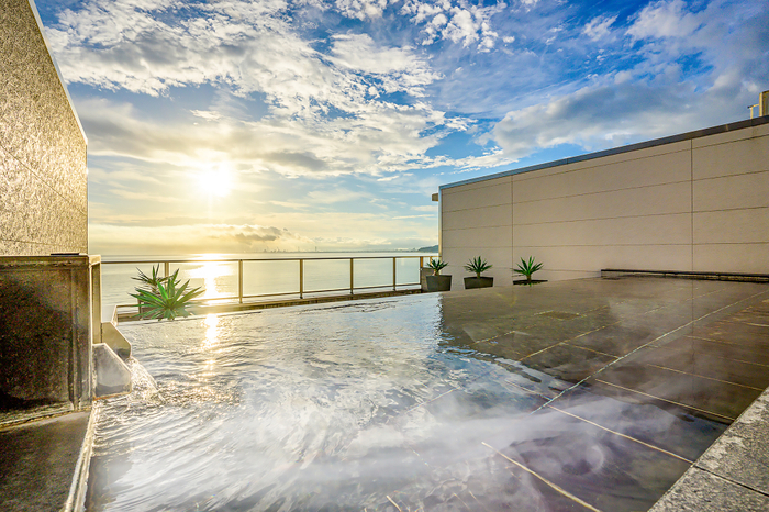 「大江戸温泉物語 別府清風」はオーシャンビューの絶景露天風呂が自慢の温泉宿です。目の前を遮るものがなく別府湾と繋がりを感じられる露天風呂で、別府温泉をゆっくりご堪能いただけます。朝焼けを見ながらの湯あみは心洗われるひと時です。