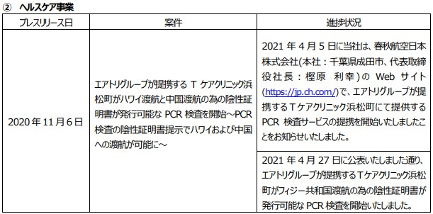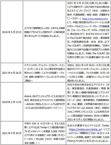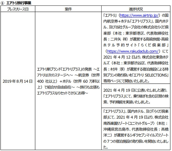 プレスリリース案件の進捗状況に関するご報告 株式会社エアトリ 2021-05-13 18:10 当社はこれまでに発表いたしましたプレスリリースの各案件につき、5月1日時点において進捗がありました主な案件の状況について、以下の通りご報告いたします。 ■各案件の進捗状況 格安航空券(国内線)を比較・予約|飛行機チケット・LCC予約なら【エアトリ】 格安航空券・飛行機チケット・LCCの比較サイト「エアトリ」です。エアトリなら、日本国内の航空会社14社の一括比較検索ができます。 https://www.airtrip.jp/ ジャンル: 旅行・お出かけ 金融・経済 BtoB・ビジネス タグ: エアトリ 旅行 トラベル プレスリリース 進捗 画像一覧 一括ダウンロード