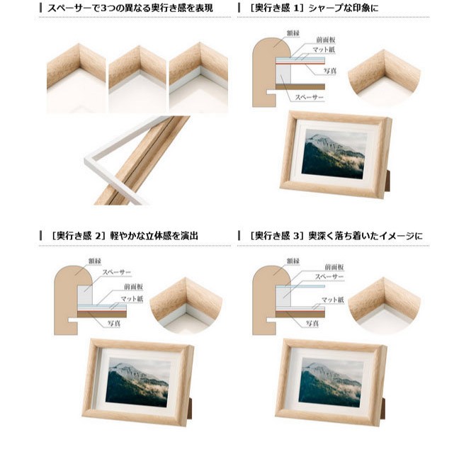 写真と前面版の間に空間を作り出し、立体感を演出するための約8mm厚のスペーサーを採用しています。前面板・マット紙と合わせ、3つのパーツの順番を入れ替えることで、作品や飾る場所に合わせて3通りの異なる奥行き感で写真を飾ることができます。