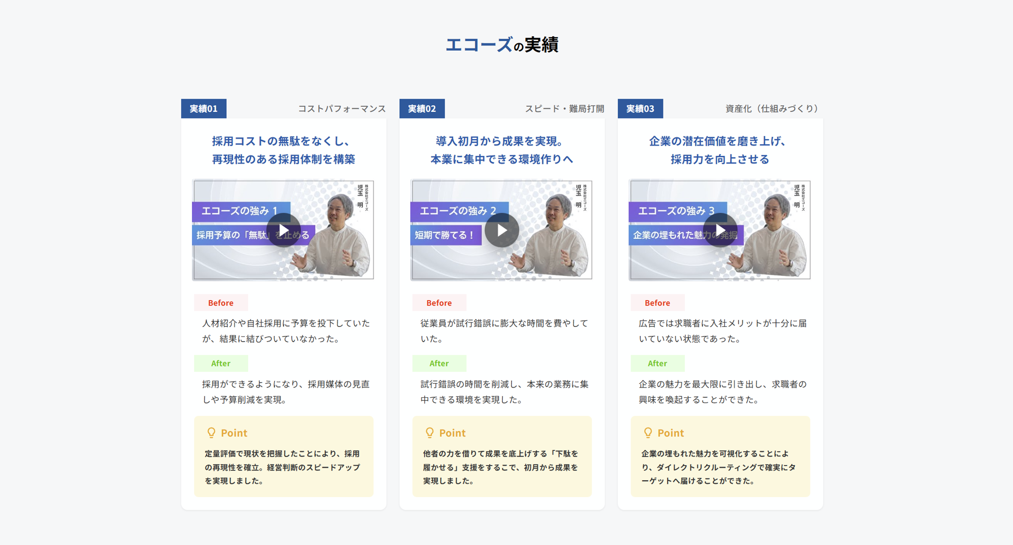 今回、これら3つの強みをより直感的に検討いただけるよう、サイトも全面的に刷新しました。専門用語を控えた「採用代行」への表現変更や解説動画の導入により、導入から「卒業」までのプロセスを透明化しています。