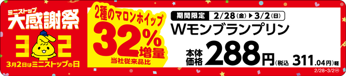 ミニストップは、3月2日(日)の「ミニストップの日」に合わせて、おトクな大感謝祭を実施中です。日頃のご愛顧に感謝の気持ちを込めまして、2月28日(金)よりミニストップ大感謝祭第3弾として3と2で「ミニストップ」の「ミ(3)ニ(2)」の語呂にあわせたミニストップの人気商品の増量企画や値引きセール、ミニストップアプリ会員さま限定のイベントなどを企画してまいります。ミニストップは今後も、ミニストップならではの商品開発・店舗づくりを通じて、「おいしさ」と「便利さ」で、笑顔あふれる社会を実現してまいります。