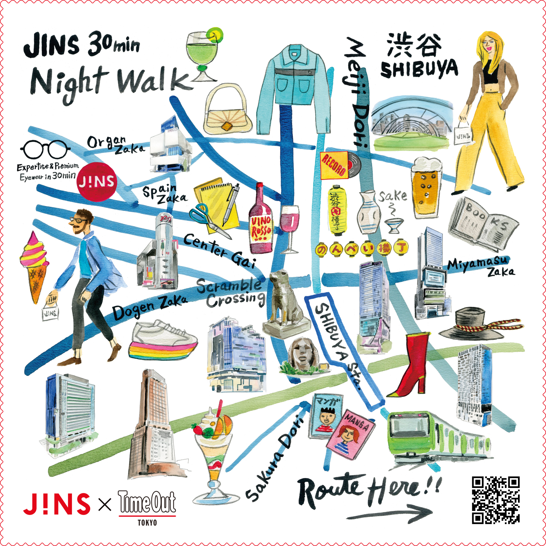 企画コンセプトは、お会計からメガネが完成するまでの30分、日本の夜の街を満喫してもらうというもの。「最短30分でメガネが受け取れる」強みをセリングポイントに設定して、お会計からの待ち時間30分の間に日本の各都市で楽しめる、夜の街歩きプランを提案しました。