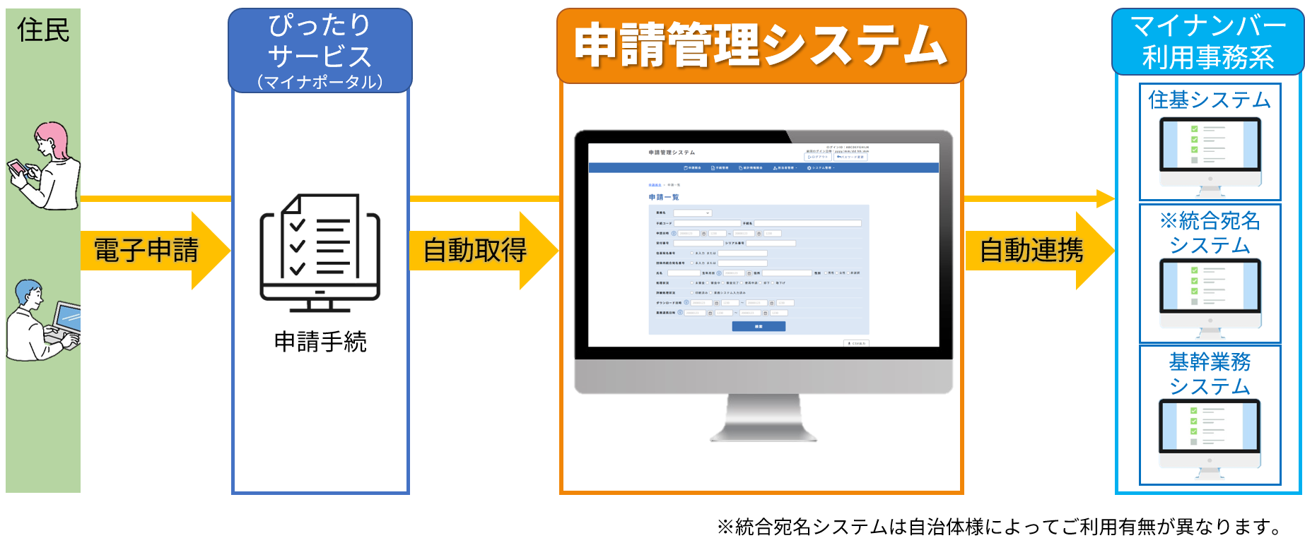 申請管理システムは、政府が提供している「ぴったりサービス・マイナポータル」から住民向け手続きの申請データを自治体様の基幹システムへ一気通貫にて自動連携を実現させるオンライン接続システムです。