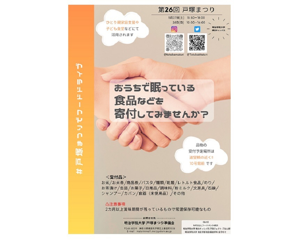 フードドライブとは家庭で使用しない食品などをひとり親家庭や子ども食堂などに寄付し、支援を行う活動です。今回の戸塚まつりでは、NPO法人フードバンク横浜( https://www.fbyokohama.jp/ )ご協力のもと、準備会学生や社会福祉学科のゼミが企画しました。学生や教職員、地域の方から寄付品を募り、支援を行います。
