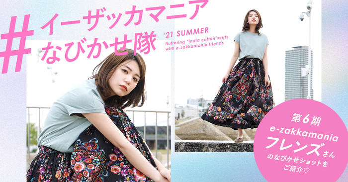 特集ページには、これからの夏を彩り、快適に過ごしていただけるスカートを中心にその魅力を見た目でも楽しくお伝えするべく「#イーザッカマニアなびかせ隊」をキャッチコピーにして、フレンズのみなさまやイーザッカマニアスタッフのコーディネートと共にご紹介しております。