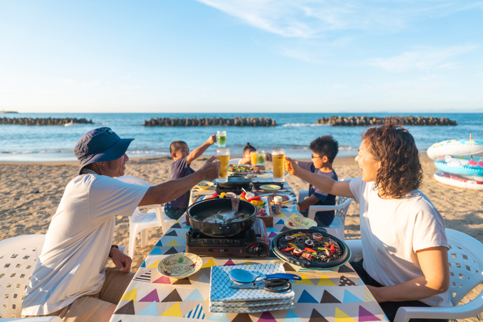 海辺で自分たちで焼いて食べるスタイルで、