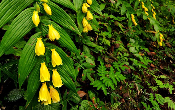 「ジョウロウホトトギス」は牧野富太郎博士が高知県の横倉山で発見し、ロシアの植物学者マキシモヴィッチ博士が命名しました。四国と九州に自生しています。一方、「キイジョウロウホトトギス」は、和歌山県の紀伊半島南部にのみ自生します。どちらも絶滅危惧II類に分類される希少な植物で、黄色い花を鈴なりに咲かせる姿は大変美しく、この優雅な花を平安時代の宮中に奉仕する貴婦人「上臈(じょうろう)」に見立てて名付けられました。