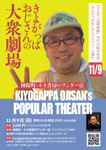 文芸書などの刊行を行うTRASHBOOKS(所在地:神奈川県厚木市、代表:杉本健太郎)は、絵本作家きよがっぱおじさんプロデュース興行「きよがっぱおじさんの大衆劇場」を2025年11月9日(日)に神保町古書店街のネオ書房アットワンダー店で初開催します。