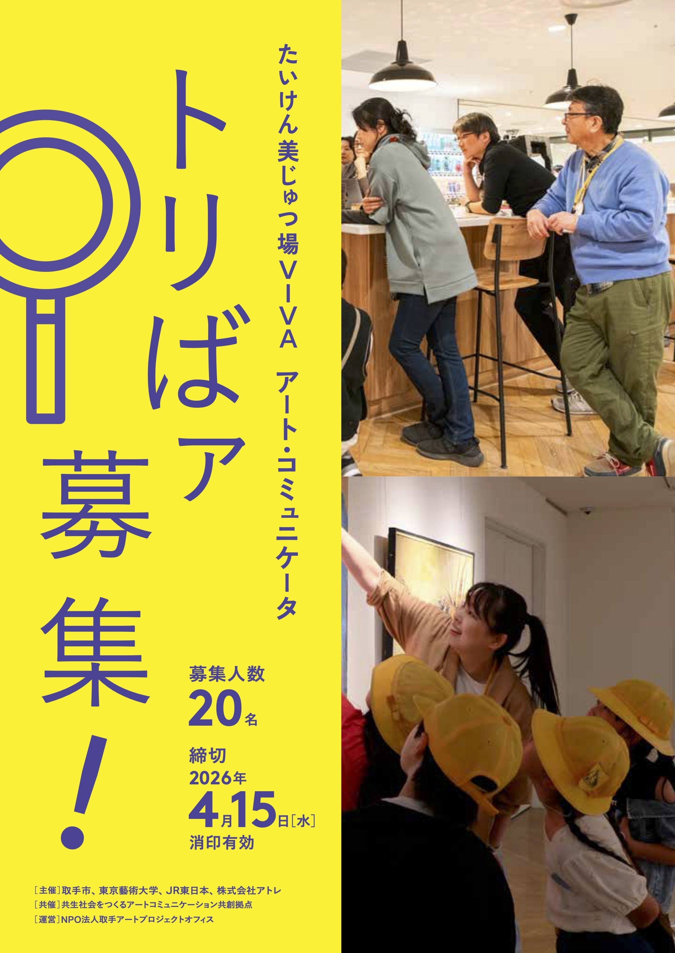 この度、VIVAにおいて『たいけん美じゅつ場フォーラム2026』を2026年3月7日(土)に開催いたします。今回のフォーラムでは「つながりがつくる私の居場所-市民・駅ビル・大学・行政でひらくまちの関わりしろ」をテーマに、東京藝術大学長の日比野克彦氏、取手市長の中村修氏、東京藝術大学社会連携センター教授の伊藤達矢氏、株式会社アトレ代表取締役社長の高橋弘行がトークセッションを行います。また、アート・コミュニケータ「トリばァ」第7期と高校生アート・コミュニケータ「nexトリばァ」第2期の募集を行います。