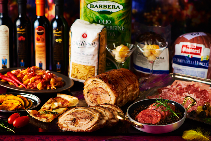 牛肉の鉄板焼き ローズマリーの香り、ポルケッタ(ローストポーク セージ風味)、アッバキョ アラロマーナ(ラム肉のロースト)、コテキーノ(豚のソーセージ レンズ豆添え)、パスタ ペンネアラビアータ、ラザニアと大阪野菜のあったかグラタン、サルシュチャのピッツア、マルガリータピッツア 大阪春菊と共に、他