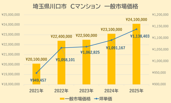 Cマンションの一般市場価格・坪単価の推移は上記【図5】の通りです。