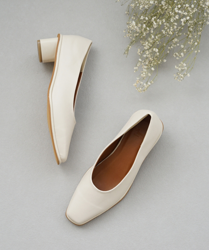 シンプルなストラップなしのパンプスも、ヒールやトゥの形で今年らしさを発揮。
