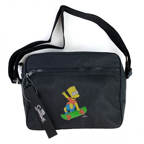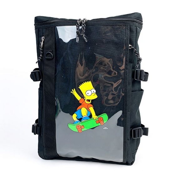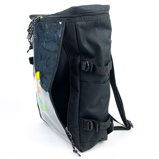 ブラックカラーのリュックは、ひと目でクールな印象♪中央には、スケボーを楽しむバートのデザインが描かれています。カラフルなバートガアクセントになってますね♪