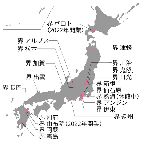 「界」は星野リゾートが全国に展開する温泉旅館ブランド。「王道なのに、あたらしい。」をテーマに、季節の移ろいや和の趣、伝統を生かしながら現代のニーズに合わせたおもてなしを追求しています。また、その地域の伝統文化や工芸を体験する「ご当地楽」や、地域の文化に触れる客室「ご当地部屋」が特徴です。現在、全国各地に展開しており、2022年1月に19施設目となる「界 ポロト」が北海道・白老温泉に開業しました。