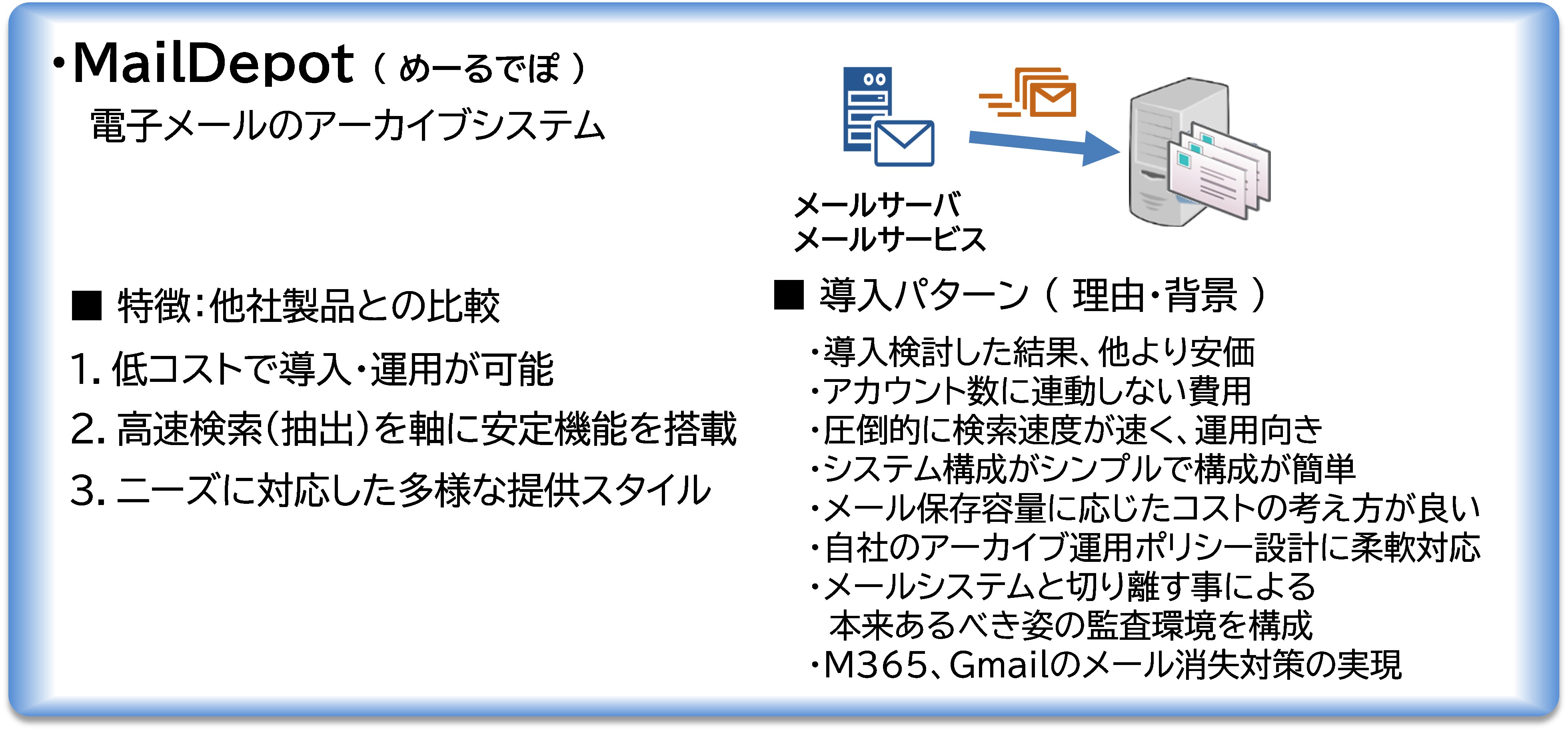 送受信メール・添付ファイルも含め全文保存し、超高速検索、改ざん検知により内部統制・コンプライアンス強化とメール証跡管理を実現