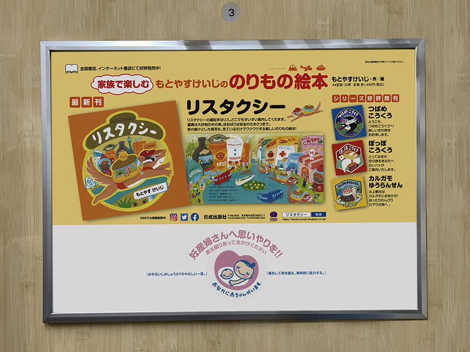 株式会社佼成出版社(所在地:東京都杉並区 代表取締役:中沢 純一)は、2022年9月に発刊したのりもの絵本『リスタクシー』(もとやすけいじ・作/絵)が販売好調の中、「都営地下鉄浅草線」(東京都交通局)、「神奈中バス」(神奈川中央交通)などの車内に、交通広告ポスターを掲出しました。