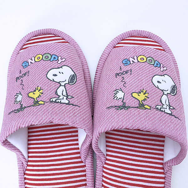 スヌーピーとウッドストックの、外縫いスリッパです。足入れ部分のボーダーがポップですね。カジュアルな雰囲気もあり、デイリー使いにピッタリです。