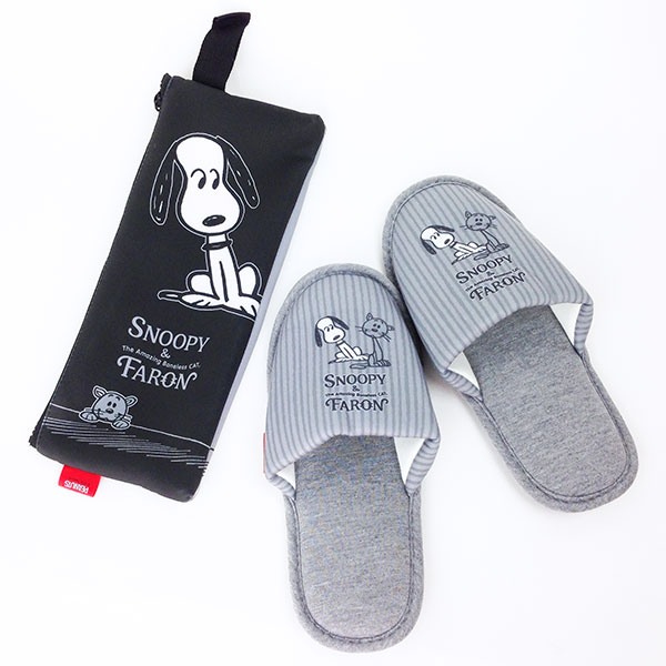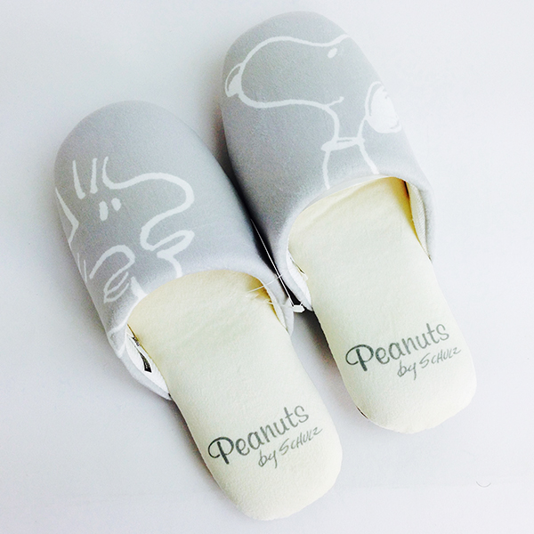 まずは、ソニークリエイティブプロダクツのスリッパをご紹介♪片方ずつにスヌーピーとウッドストックがデザインされています。ホワイト×ライトグレーの色合わせがオシャレですね。デイリー使いにも、お客様用にも使えてオススメの一品です。