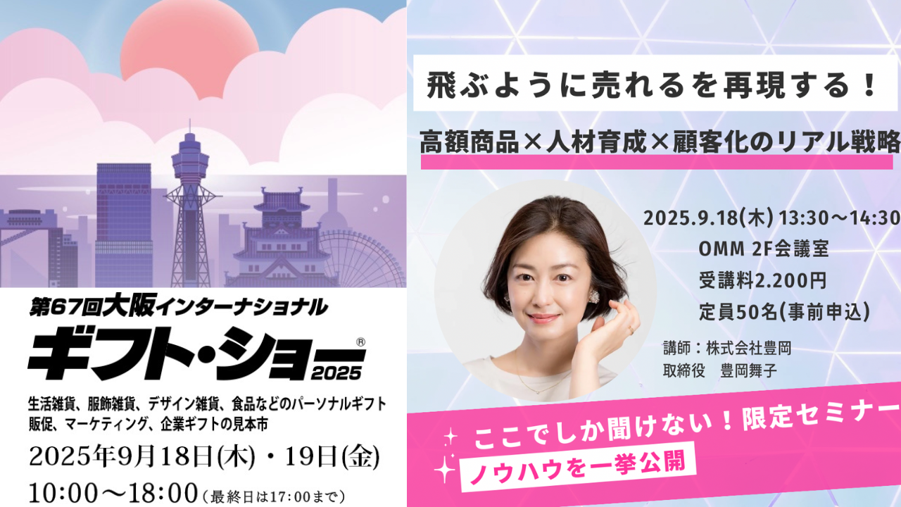 長年のブランドマネジメント経験と小売業・その他サービス業におけるコンサルティングや企業向け研修を行う株式会社豊岡(本社:東京都千代田区、代表:豊岡 舞子)が株式会社ビジネスガイド社主催の第67回大阪インターナショナル・ギフト・ショー2025にて特別セミナーを実施する。