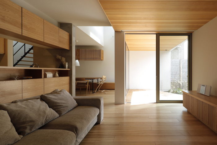 子どもたちには、のびのび育って欲しい。そんな夫・Hの想いから、3人の男の子が自由に動き回れる動線の工夫も施しています。ウッドデッキをリビングとダイニングにフラットにつなげ、天井も木質素材で揃えることで広がりを演出。広さを感じるリビングで、子どもたちはサッカーもしたりするそうです。