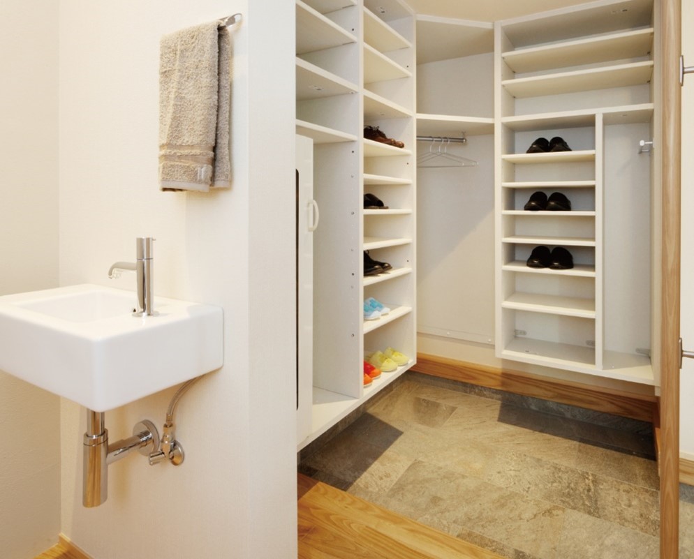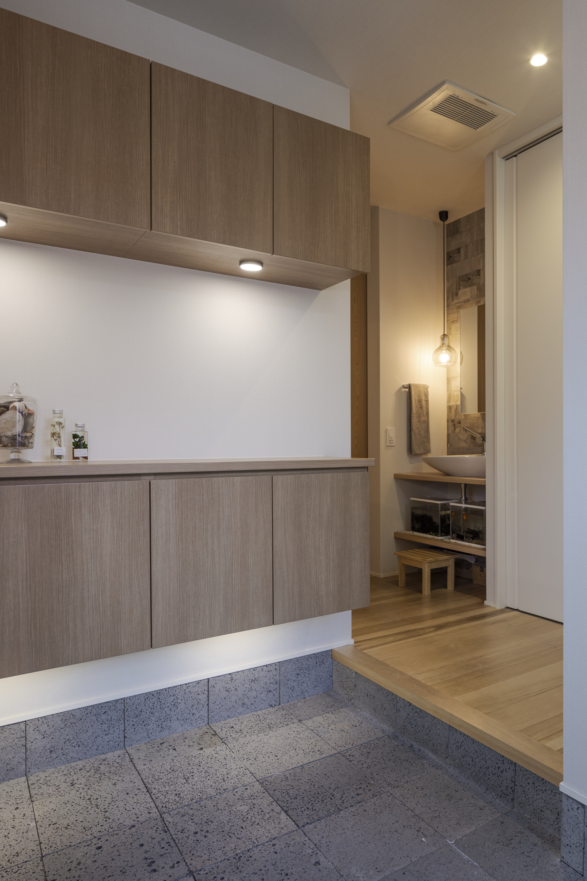 3人の男の子がいるN夫妻の住まいは、玄関ホールに洗面コーナーと収納があります。洗面コーナーには、まだ小さい子どもが手洗いをしやすいよう踏み台を用意。洗面の下に踏み台をしまえるスペースも設けています。