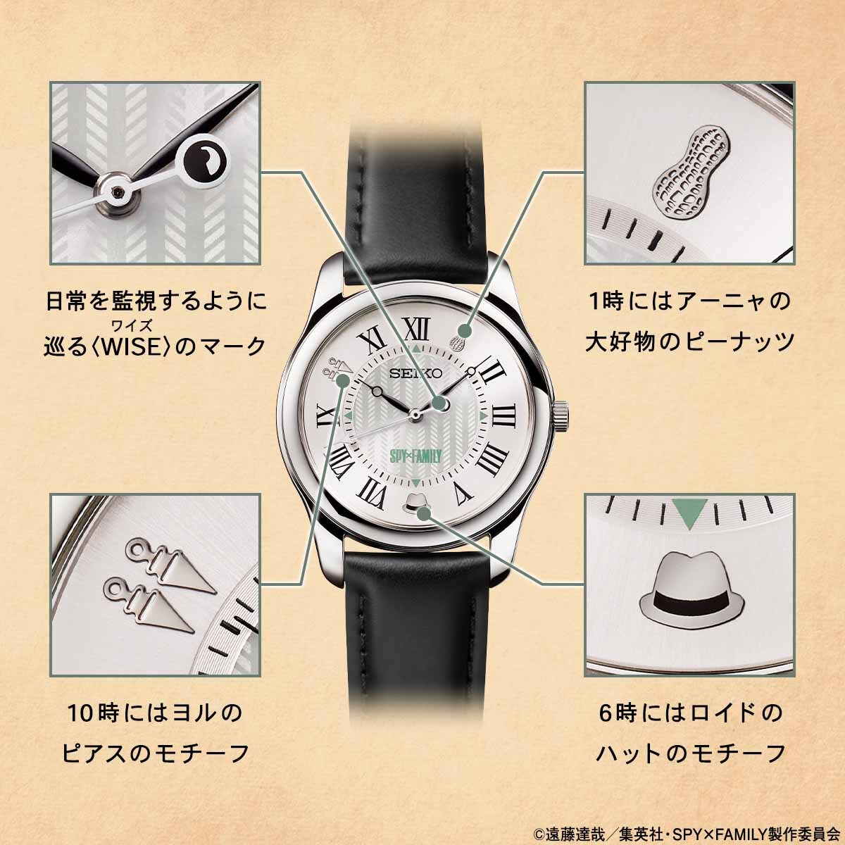 1時・6時・10時のインデックスには、アーニャの大好物のピーナッツ・ロイドのハット・ヨルのピアスのモチーフをデザイン。