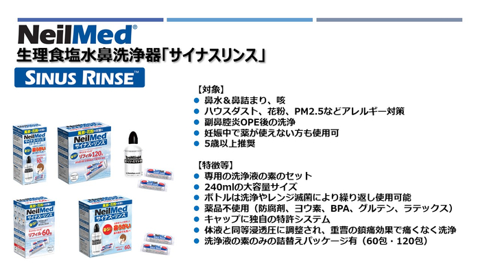 サイナスリンスは、もともと鼻の疾患で悩んでいた医師の研究成果によって開発された生理食塩水を用いた鼻うがい製品です。