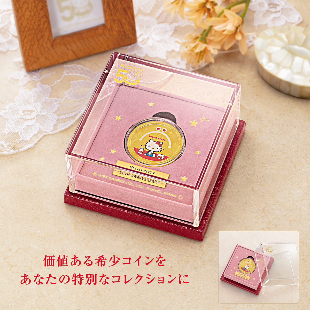 ハローキティに初めて会った頃を思い出しながら、大切な金貨を飾って楽しめる特製展示ケースとともにお届けいたします。クック諸島政府発行の法定貨幣で、発行証明書付き。